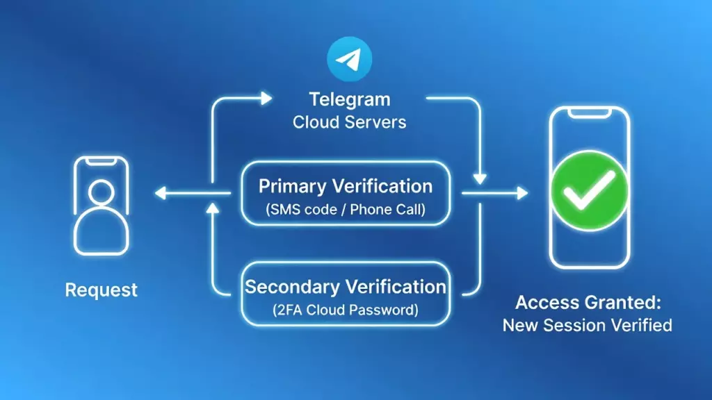 Процесс авторизации включает двухэтапную верификацию: сначала система отправляет код подтверждения на указанный номер, затем клиент подтверждает его. Для аккаунтов с включенной двухфакторной аутентификацией добавляется ещё один уровень — облачный пароль, основанный на протоколе Secure Remote Password версии 6a.