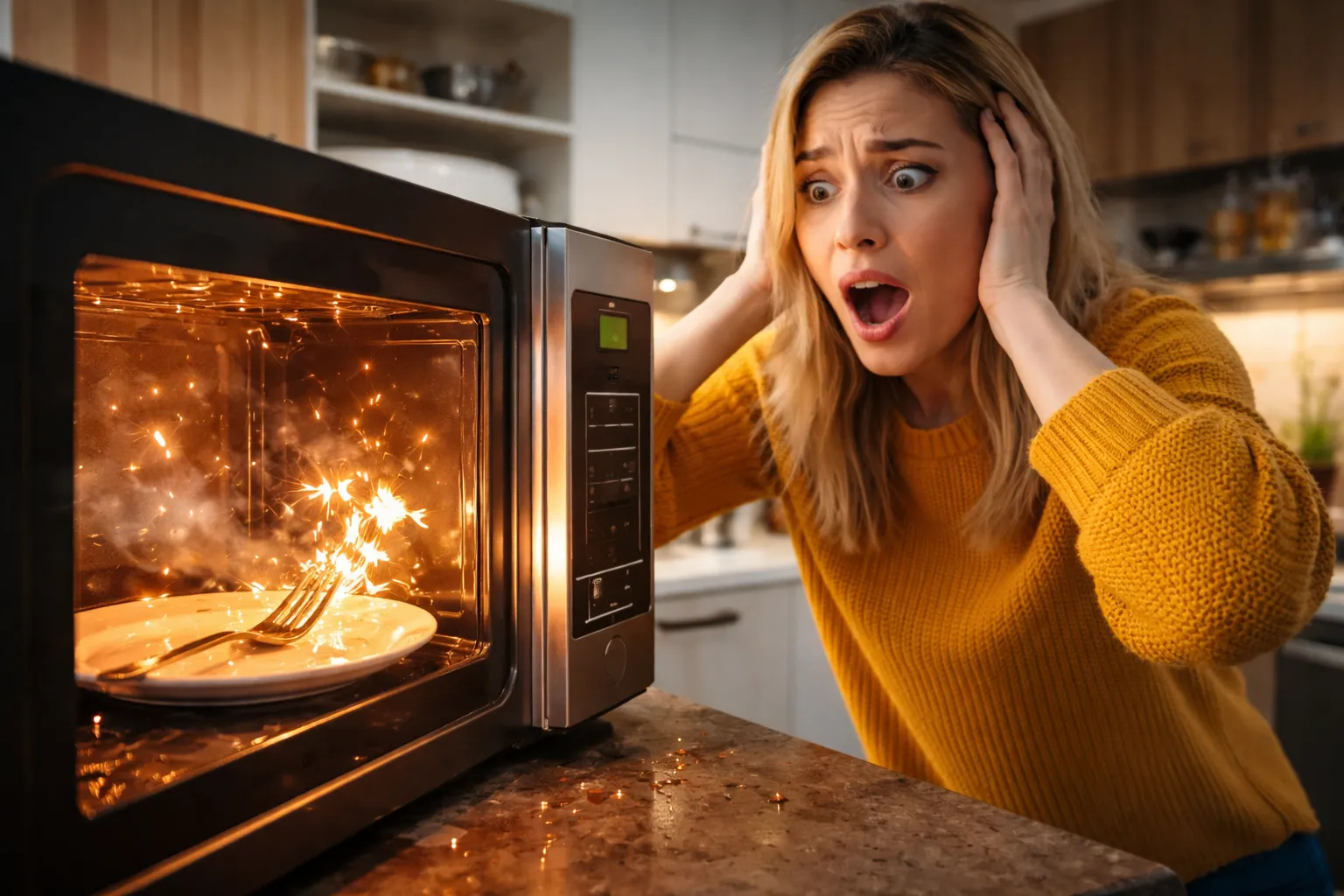 Real talk: fires can start when metal creates sustained arcing near combustible materials. If you’re heating food in a container with metal trim, or if crumpled aluminum foil is near paper packaging, the sparks can ignite a fire.