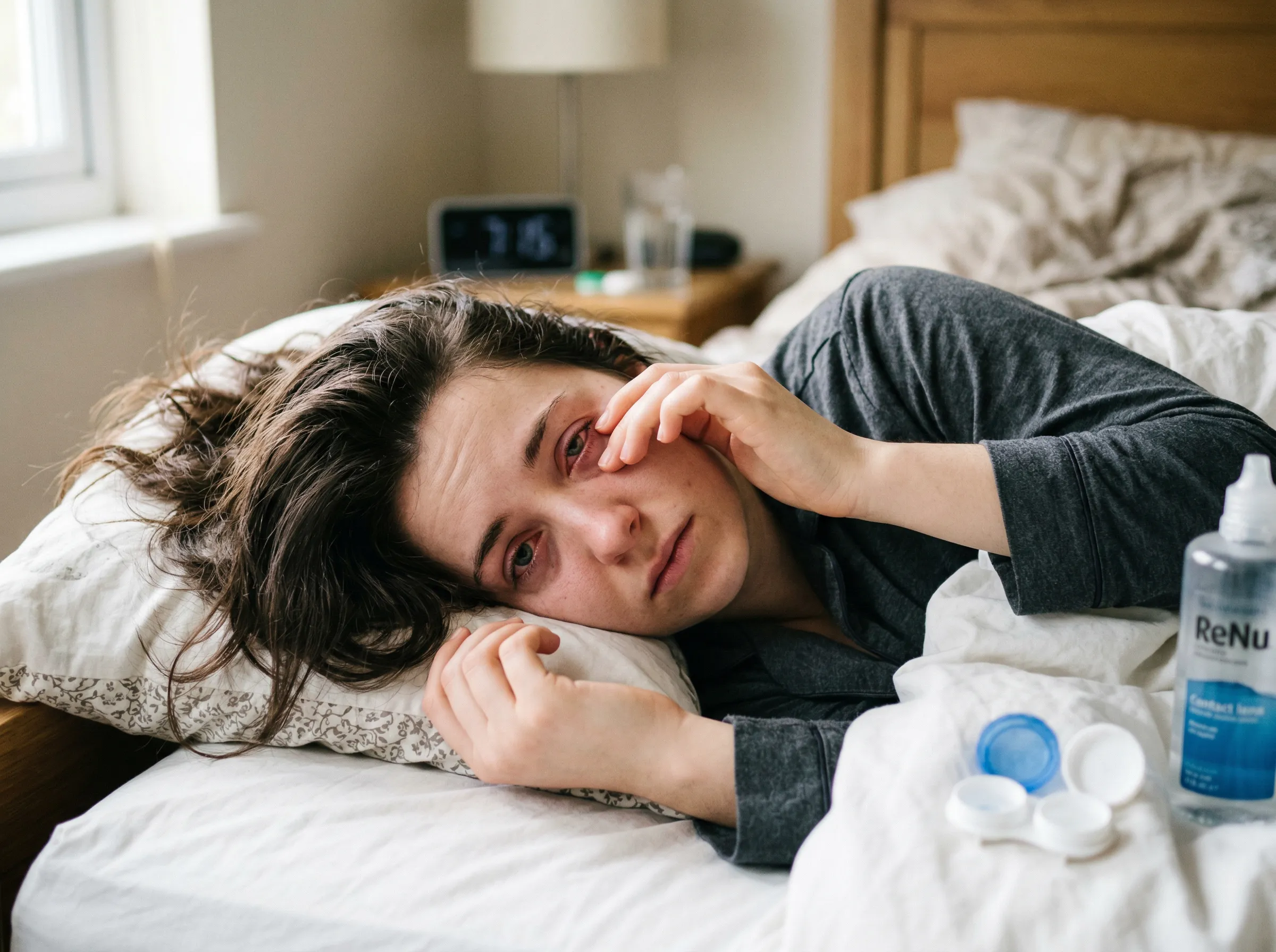Even without infection, sleeping in contacts causes inflammation, dryness, and discomfort. Eyes may feel gritty or burn upon waking.